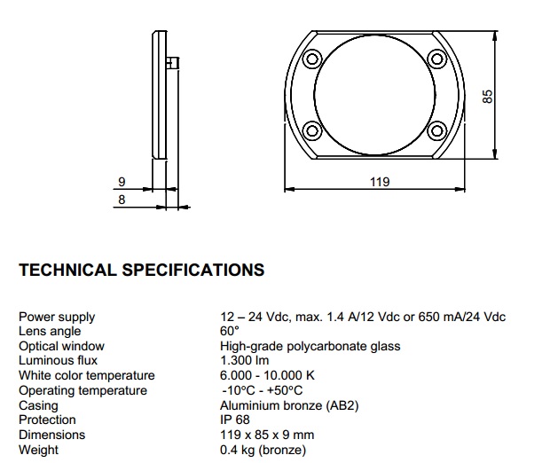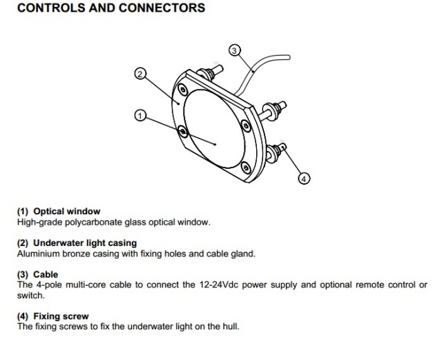 ASTELアンダーウォーターライトは、4つの6mmφと10mmφの電線を通す穴のみで取付可能。